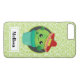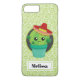 Eine personalisierte Kasematelefonbox mit einer niedlichen Abbildung eines grünen Kakteen, das in einer Blume sitzt. Große kawaii Augen und ein rotes Sombrero tragen. Der Hintergrund ist ein Muster mit kalkgrünen Wirbel.