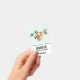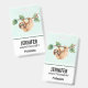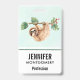Benennen Sie Abzeichen mit einem zauberhaften Faultier, das von einem Baumzweig auf dem Kopf hängt. Der Baumzweig ist mit tropischen Blätter und Beeren dekoriert. Set auf hellgrünem Hintergrund.
