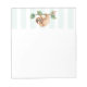 Ein Notizblock mit einem zauberhaften Faultier, der von einem Baumzweig auf dem Kopf hängt. Der Baumzweig ist mit tropischen Blätter und Beeren dekoriert. Set auf einem hellgrün-weiß gestreiften Hintergrund.