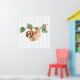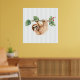 Ein Poster mit einem bezaubernden Faultier, der von einem Baumzweig auf dem Kopf hängt. Der Baumzweig ist mit tropischen Blätter und Beeren dekoriert. Set auf einem hellgrün-weiß gestreiften Hintergrund.
