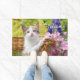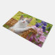 Ein kurioses, junges Kätzchen, weiß mit Tortoishölle-Flicken, mit schönen blauen Augen, aufrecht sitzen in einem kleinen Korbsessel in einem bunten blühenden Garten und beobachten neugierig. Ein niedliches Baby Cat Foto von Katho Menden. Diese Türmatte ist eine Geschenkidee für Katzenliebhaber.