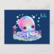 Postkarte mit einem Bild eines niedlichen gürteligen Oktopus mit einer Blume auf ihrem Kopf. Große, helle Augen und ein freundliches Gesicht.