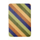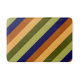 Eine mittelgroße Badematte mit einem Muster aus mehrfarbigen diagonalen Streifen in olivgrün, Salbei, Haselnussbraun, Marineblau und Bananengelb.