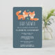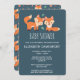 Baby Shower Einladung mit einer grafischen Abbildung von 2 orangen Füchsen sehen niedlich und glücklich. Dunkelgrüner Hintergrund.