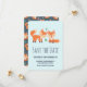 Geburtstagsparty Save the Date mit einer grafischen Abbildung von 2 orangefarbenen Füchsen, die niedlich und glücklich aussehen.