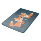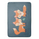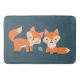 Eine Badematte mit einer grafischen Abbildung von 2 orangefarbenen Füchsen, die niedlich und glücklich aussehen. Dunkelgrüner Hintergrund.