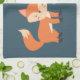 Ein Küchentuch mit einer grafischen Abbildung von 2 orangefarbenen Füchsen, die niedlich und glücklich aussehen. Dunkelgrüner Hintergrund.