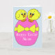 Happy Oaster Card mit zwei niedlichen, flauschigen, gelben Cartoon Osterküken, die auf einem rosa Osterei sitzen und mit einem großen gelben Bogen verbunden sind. Personalisieren Sie diese Karte einfach, um einen Namen hinzuzufügen oder die Nachricht mit dem Vorlagentext zu ändern. Im Inneren der Karte steht die Meldung "Haben Sie ein knackendes Oster". Frohe Ostern!