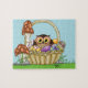 Eine niedliche, braune Eule, die in einem Osterkorb mit Ostereiern sitzt.