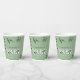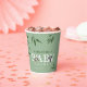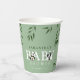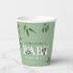 Diese zeitgenössischen, aber niedlichen Baby Dusche personalisierte Papiertassen mit Aquarell tiefgrüne Blattwerk Blätter umrahmt den Text "BABY" mit zwei spielerischen Panda-Bären auf einem neutralen eukalyptus grünen Hintergrund mit Namen und Datum.