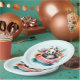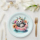 Papier Teller mit einem bezaubernden sommerlichen Bild. Ein Aquarellbild mit einem schwarz-weißen Panda in einem Schwimmring im Wasser. Umgeben von hübschen Wildblumen. Ein total kalter Bär.
