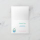 Eine Babydusche-Dankeschön-Karte mit einer niedlichen und glücklichen Pinguinfamilie von vier Personen mit Ei-ähnlichen Proportionen, die an einem Banner festhalten, auf dem steht: "Vielen Dank!" Papa, Baby, Schwester und Mami Pinguine in Blau, Grün, lila und Rosa. Der kleine Pinguin im Innern der Karte hält an einem Geschenk fest, während auf der Kartenrückseite der kleine Pinguin mit einem Schnuller in seinem Schnabel an einem Umschlag festhält, der ein Herz darauf hat.