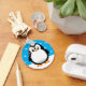 Ein niedlicher schwarz-weißer Pinguin zeichne. Schlüsselketten für Kleintiere. Im Hintergrund fleckt Schnee. Geschenkidee für Kinder.