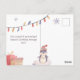 Niedliche und fröhliche Pinguinfamilie, die Spaß im Schnee hat. Editable Happy Holidays Nachricht vorne und hinten, damit Sie sie individuell gestalten können. Zurück gibt es eine festliche Lichterkette mit Geschenkboxen und einem niedlichen Pinguin.