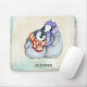 Ein personalisiertes Mauspad mit einer anmutigen Abbildung eines Pinguin-Paares, das sich zusammenkuschelt. Winterschals und Hüte tragen. Set auf einer cremefarbenen Vintagen Textur mit türkisfarbenen Akzenten an den Kanten.