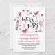 Chic Junggeselinnen-Abschied Einladung mit niedlichen Doodles in Schwarz, Heiß-Rosa und Blassrosa - Drinks, Lippenstift, glänzender Mund, kleine Herzen, glänzender Diamantring und Ballon - rund um den Begriff Miss to Mrs. in hübscher Kalligrafie. Auf der Rückseite sind fette Streifen in weiß, schwarz und heiß rosa gehalten.