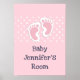 Personalisiertes Poster mit einem hübschen Bild von Pink-Girl-Fußabdrücken mit einer schweren weißen Kontur. Weiße Polka zeigt auf einem rosa Hintergrund hinter der Abbildung.