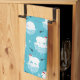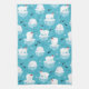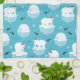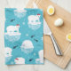 Küchenhandtuch mit niedlichem Weihnachtsmuster mit Eisbären, die auf schwimmendem Eis mit roten Weihnachtsmannmützen stehend sind. Kleine Iglus, Schneeflocken und Fische umgeben diese bezaubernden Eisbären, die auf dem Wasser abkühlen. Hellblauer Hintergrund. Niedliche und skurrile Urlaubsplanung.