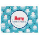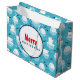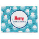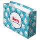 Frohe Weihnachtsgeschenktasche mit niedlichem Weihnachtsmuster mit Eisbären, die auf schwimmendem Eis mit roten Weihnachtsmannmützen stehend sind. Kleine Iglus, Schneeflocken und Fische umgeben diese bezaubernden Eisbären, die auf dem Wasser abkühlen. Hellblauer Hintergrund. Niedliche und skurrile Urlaubsplanung.