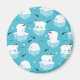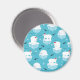 Ein Magnet mit einem niedlichen Weihnachtsmuster mit Eisbären, die auf schwimmendem Eis mit roten Weihnachtsmannmützen stehend sind. Kleine Iglus, Schneeflocken und Fische umgeben diese bezaubernden Eisbären, die auf dem Wasser abkühlen. Hellblauer Hintergrund. Niedliche und skurrile Urlaubsplanung.