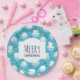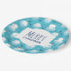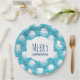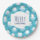 Papier Teller mit einem niedlichen Weihnachtsmuster mit Eisbären, die auf schwimmendem Eis mit roten Weihnachtsmannmützen stehend sind. Kleine Iglus, Schneeflocken und Fische umgeben diese bezaubernden Eisbären, die auf dem Wasser abkühlen. Hellblauer Hintergrund. Niedliche und skurrile Urlaubsplanung. Frohe Weihnachten in einem weißen Rahmen überlagert.