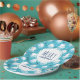 Papier Teller mit einem niedlichen Weihnachtsmuster mit Eisbären, die auf schwimmendem Eis mit roten Weihnachtsmannmützen stehend sind. Kleine Iglus, Schneeflocken und Fische umgeben diese bezaubernden Eisbären, die auf dem Wasser abkühlen. Hellblauer Hintergrund. Niedliche und skurrile Urlaubsplanung. Frohe Weihnachten in einem weißen Kreis geschrieben.