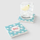 Stone Untersetzer mit einem niedlichen Weihnachtsmuster mit Eisbären, die auf schwimmendem Eis mit roten Weihnachtsmannmützen stehend sind. Kleine Iglus, Schneeflocken und Fische umgeben diese bezaubernden Eisbären, die auf dem Wasser abkühlen. Hellblauer Hintergrund. Ein weißer Kreis mit einer blauen Grenze überlagert mit frohen Weihnachten innen geschrieben. Niedliche und skurrile Urlaubsplanung.