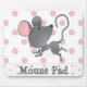 Eine süße kleine Maus, die auf seinem Mauspad mit einem rosa Polka-Punkt-Hintergrund hängt. Sie können den Text mit einem Monogramm oder einem anderen Text bearbeiten, wenn Sie möchten.