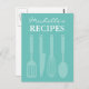 Niedliches Rezept Postkarte mit Küchenutensilien. Personalisierte Textvorlage mit Löffelmesser und Spatel. Türkisblau oder benutzerdefinierte Hintergrundfarbe. Zum Abendessen Party, Brautparty, Hochzeit, Geburtstag etc..