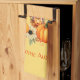 Eine niedliche Kürbismühle mit einem gepflegten Kürbis, umgeben von einem Herbstkranz aus Blume, Kürbissen und Blätter.