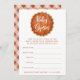 Babydusche, die eine Spielkarte aus der A Little Süsse Pie Fall Baby Shower Collection mit "Baby Guesses" in weißer Schrift auf einer Kürbiskuchenillustrierung zeigt. Die Gäste können ihre Vorhersagen über Geburtsdatum, -zeit, -gewicht und -länge des Babys aufzeichnen und so einen unterhaltsamen und interaktiven Weg finden, um Freunde und Familie an der Feier zu beteiligen. Die Rückseite der Karte zeigt ein passendes Gingham-Muster in warmen Terrakotta- und goldbraunen Tönen, das einem Herbst- oder Kürbisgewirr einen rustikalen Charme verleiht.