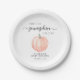 Niedliche, geschlechtsneutrale Teller für Ihre Herbstbabwdusche mit "A Sweet Little Pumpkin Is On It" in schlichter grauer Typografie und einem stilvollen Drehbuch sowie einer pastellorangefarbenen Wasserfarbe eines Kürbchens. Geben Sie auf Wunsch das Geschlecht des Babys an (z.B. "ist unterwegs").