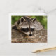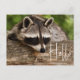 Eine Postkarte mit einem Foto eines niedlichen und neugierigen Waschbads, der auf einem Holzlog sein Gesicht ruht. Schön.