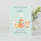 Diese niedliche Ostergrusskarte ist ein Christliches religiöses Motiv in einem pastellfarbenen Aquarellbild. In der Mitte wird ein Holzkreuz abgebildet. Kleintiere, wie Lamm, Küken und Hasen, werden rund um das Kreuz abgebildet. Frühlingsblumen und Ostereier betonen das Bild.