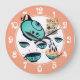 Niedliche Küchenuhr in Retro-Ambiente mit Teekanne und Teedusche mit Duschhaube und fröhlich kleinen, glänzenden Teebechern. Die Auswahl an Hintergrund- und Zahlenfarben ist perfekt für Teeliebhaber.