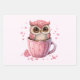 Papierblätter mit einem bezaubernden Bild einer Eule, die in einer Tasse sitzt. Hört herumschwebend und eine Single-Rose am Ende der Tasse platziert.