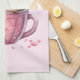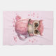 Ein Küchentuch mit einem bezaubernden Bild einer Eule, die in einer Tasse sitzt. Hört herumschwebend und eine Single-Rose am Ende der Tasse platziert.