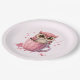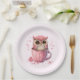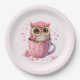 Teller aus Papier mit einem bezaubernden Bild einer Eule, die in einer Kaffee-Tasse sitzt. Hört herumschwebend und eine Single-Rose am Ende der Tasse platziert.
