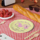 Es ist Zeit für Party! Dieses niedliche Flamingo-Trio wird jedem Party etwas tropischen Spaß machen. Gezeichnet in Cartoon-Illustration auf einem hellgelben und weißen Polka Punkt Hintergrund.