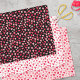 Niedliche Faltblätter für den Valentinstag mit drei passenden, handgezeichneten Herzmustern in verschiedenen Rosatönen vor schwarzem Hintergrund, weißem Hintergrund und blassrosa Hintergrund.