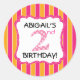 Dieser runde Aufkleber zeigt das zweite Geburtstagsthema eines trendigen Mädchens. Der Hintergrund ist hell rosa und orange, die senkrechten Streifen sind in einem Wirblen Rahmen in der Mitte mit einer großen rosa Nummer zwei dargestellt, die den 2. Geburtstag Ihres Kindes darstellt. Mit anpassbarem Text können Sie den Namen Ihres Kindes hinzufügen. Siehe www.zazzle.com/daisylin712 für entsprechende Einladung.