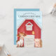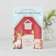 Diese individuelle Party Einladung zeichnet sich durch ein niedliches, im Aquarellstil gehaltenes Bauernthema aus. Im Hintergrund befindet sich ein Bild einer großen roten Scheune, vor der niedliche Nutztiere stehend sind. Rechts ist ein Baby-Schwein, und zu den links ist eine Babykuh. Ein kleines Küken steht auf der Tür.