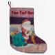 Dieser Strumpf aus Strickwaren hat ein Bild vom Weihnachtsmann mit seinem Sack gefüllt mit Geschenken, die alle umhüllt und für die Weihnachtslieferung bereit sind. Sie sehen einen gelben Teddy mit einem roten Bogen und einen blauen Hase, der sich einfach aus dem grünen Sack herausstürzt. Vater Weihnachten hält einen bunten, rot und goldgestreiften Weihnachtsweih, der einen Süßestäbchen und kleinere Geschenke darin hat, hält er auch ein kleines Geschenk in seiner Hand. Die niedliche Illustration ist auf einem farbenfrohen gestrickten Hintergrund, um ihm ein Shabby Chic Vintagen Aussehen zu geben. Das ursprüngliche santa-Bild ist ein Aquarellbild, das ich vor ein paar Jahren entworfen habe. Auf diesem niedlichen Strumpf sieht das bunte und traditionelle Festbild großartig aus. Der gestrickte Hintergrund ist ein Bild meiner eigenen Patchwork-Decke, die mit Retro-Stoffen zusammengesetzt wurde. Ich denke, dieser originelle Weihnachtsfest-Strumpf wird für den Weihnachtsfeuer perfekt sein. Dies ist ein benutzerdefinierbarer Strumpf , den Sie mit Ihrem eigenen Text personalisieren können.