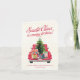 Eine festliche No-Foto-Urlaubskarte mit den Worten "Der Weihnachtsmann kommt in die Stadt" in einer lustigen Schrift mit einem rustikalen Aquarellwagen gefüllt mit Geschenken, Weihnachtsbaum und Weihnachtsmannmütze. © 2020-Present | Das Gepunktete Olivenöl | Alle Rechte vorbehalten.