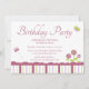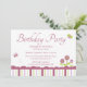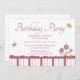 Diese Mädels Geburtstagsfeier lädt zu einer Blume und Schmetterlinge Thema. Zwei Schmetterlinge fliegen herum, drei Blume in der unteren Ecke. Am unteren Rand ist ein Streifen. Die Informationen zum Party sind in der Mitte leicht anpassbar. Kakaostudio