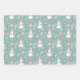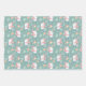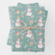 Schneemänner in Holiday-Kleidung bilden ein Muster mit Schneeflocken, Glocken und Geschenkpaketen auf zwei der Packpapierblätter dieses Set. Die dritte hat ein Muster verzierter Schneeflocken. Alle sind auf einem koordinierenden weichen grünen Hintergrund platziert. Niedlich für Kinder jeden Alters!