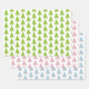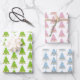 Niedliche Schneemänner und Weihnachtsbaummuster Urlaubsmuster Wrapping Paper Sheets. Das erste Blatt zeigt ein niedliches Muster von kalk-grünen Weihnachtsbäumen mit Schneemännern. Der zweite zeigt den gleichen Baum in Rosa und der dritte zeigt den Baum in hellblau.