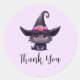 Vielen Dank für die Aufkleber mit einer lustigen Halloween-Thematik-Illustration für Katzenliebhaber. Eine mit Augen schwarze Katze mit einem großen schwarzen Hexenhut mit einem purpurpurfarbigen rosa Gürtel um den Rand.