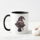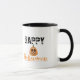 Glückliche Halloween-Tasse mit einer niedlichen schwarzen Katze in Hexenhut und einem lächelnden, geschnitzten Kürbis mit personalisiertem, maßgefertigtem Text.