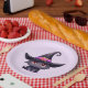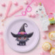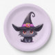 Papier Teller mit einer lustigen Halloween-Thematik-Illustration für Katzenliebhaber. Eine mit Augen schwarze Katze mit einem großen schwarzen Hexenhut mit einem purpurpurfarbigen rosa Gürtel um den Rand.